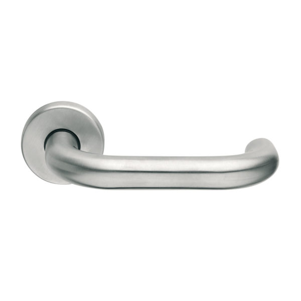 Maniglia per porte in acciaio inox, con un design tecnico.